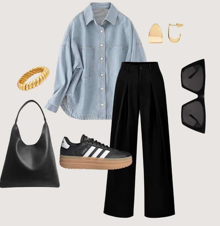 A relaxed denim shacket, black pants, and platform sneakers. The perfect mix of comfort and style. Effortless, cozy, and perfectly pretty for fall. 🍂